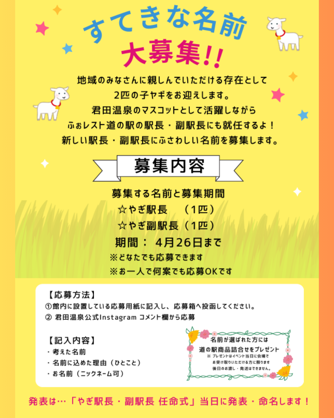 募集内容:ヤギ駅長名、ヤギ副駅長名